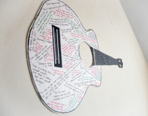 A guitar cut out from a cardboard sheet, with scribbled quotes and beautiful messages.